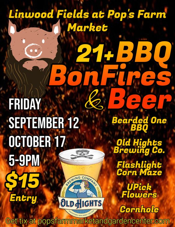 10/17 Join us at Linwood Fields for a night with Bearded One BBQ and Old Hights Brewing Co. down at the picnic grove. Ticket includes access to adult-only event, cornhole, flashlight corn maze, classic spooky movie, bonfires, and more. U-Pick pumpkins, beer, and food sold separately.